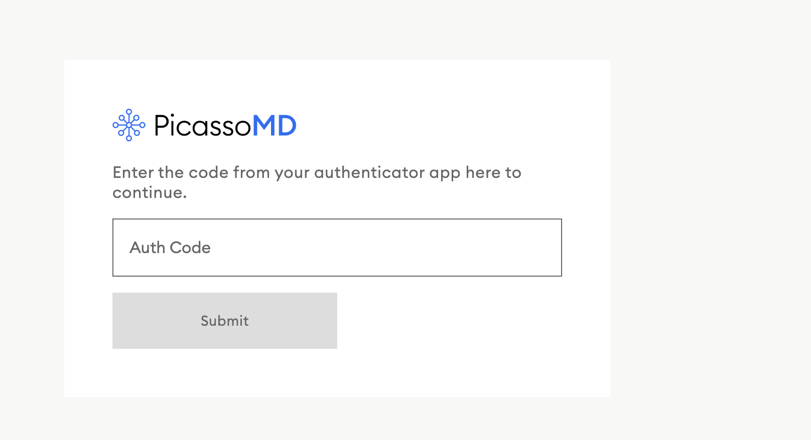 Summary: PicassoMD requires you to have individual logins with secure passwords. Once you enter the correct login credentials, we also require you to enter an authentication code.